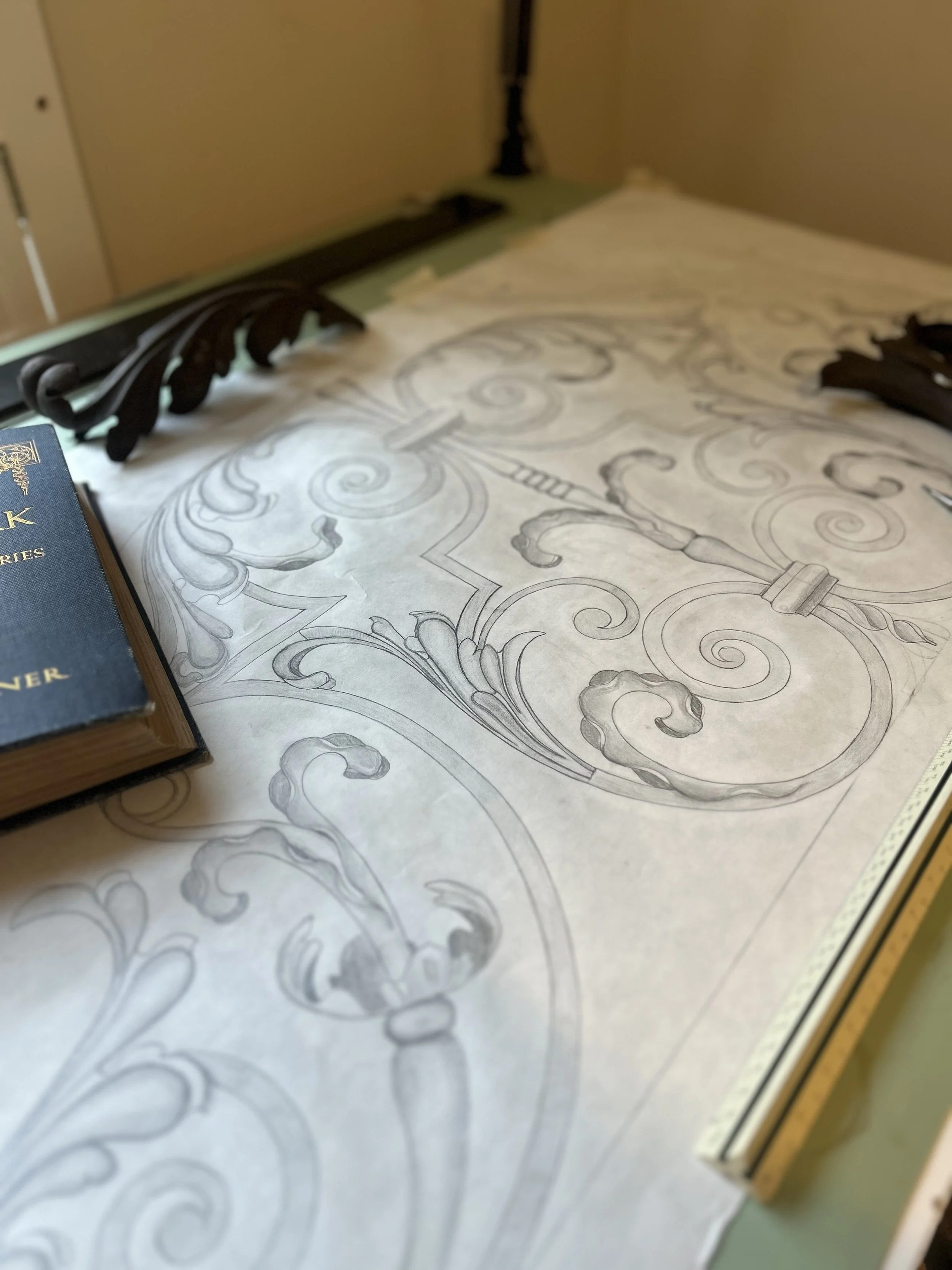 Drawing is fundamental to architectural ironwork. Services include hand-drafted elevations, CAD-based shop drawings, and 3D design development for both new construction and preservation work. With over a decade of drafting experience and formal architectural training, drawings are developed to align with project workflows — clear, scalable, and fabrication-ready. This offering supports architects, designers, and builders from concept through execution.
