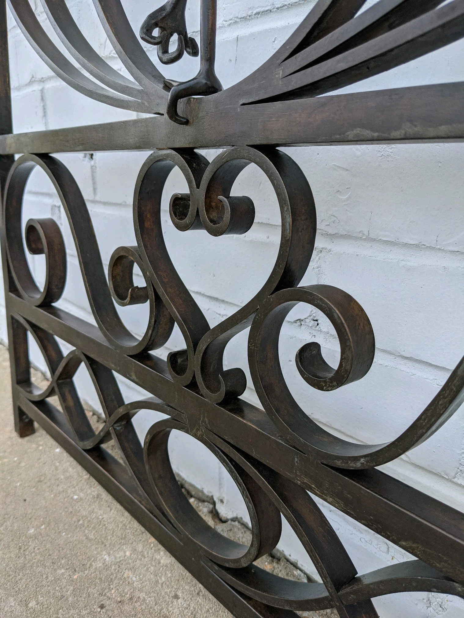 Forged in mild steel with hand-shaped scrollwork and a central quatrefoil motif. Designed to complement traditional architecture using durable, mechanically joined construction.
