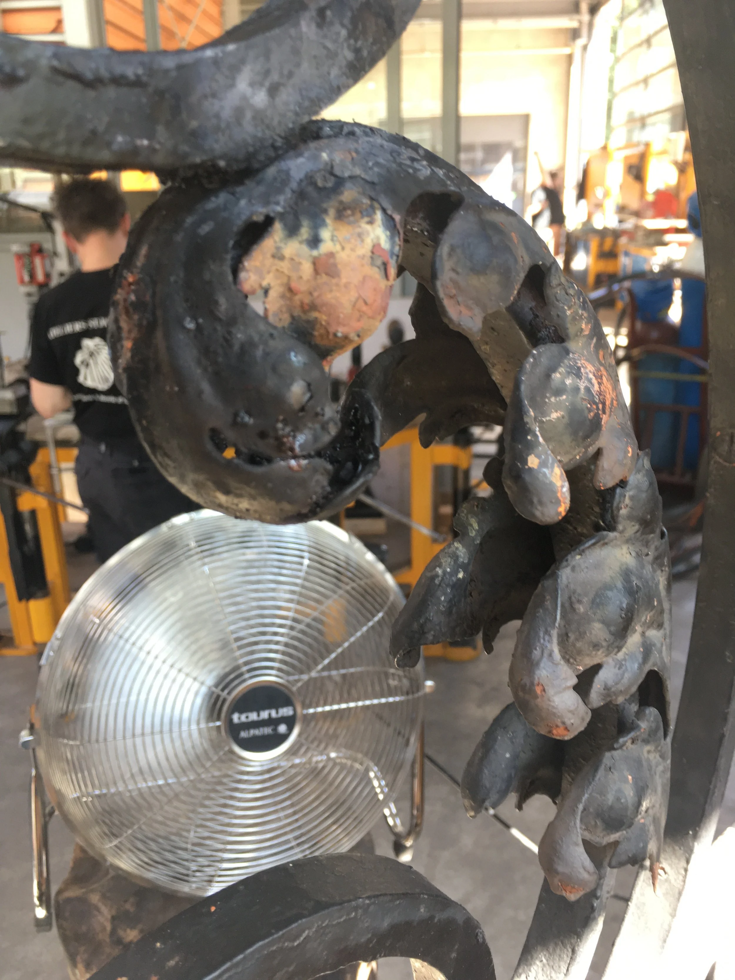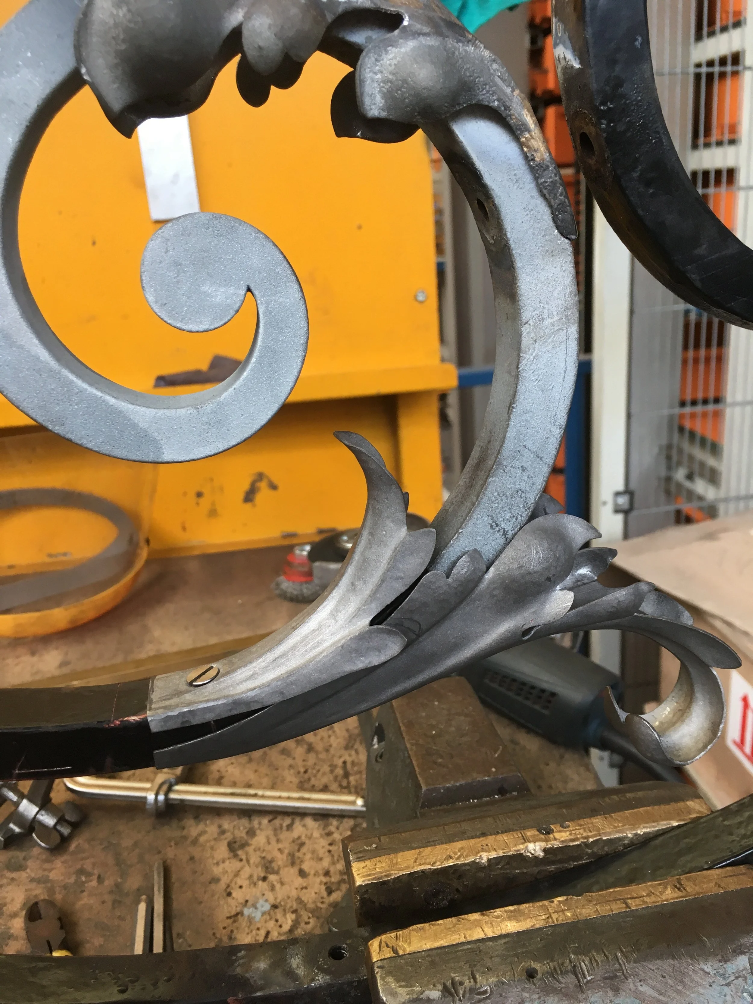 While training at Fondation Coubertin, I contributed to the restoration of the château’s architectural grilles, focusing on the repousse leafwork. Under the guidance of Master Repousseur Serge Pascal and Cédric Suire, I was responsible for labeling, grafting, and replacing damaged and destroyed leaf elements using period-accurate materials and traditional repoussé techniques.