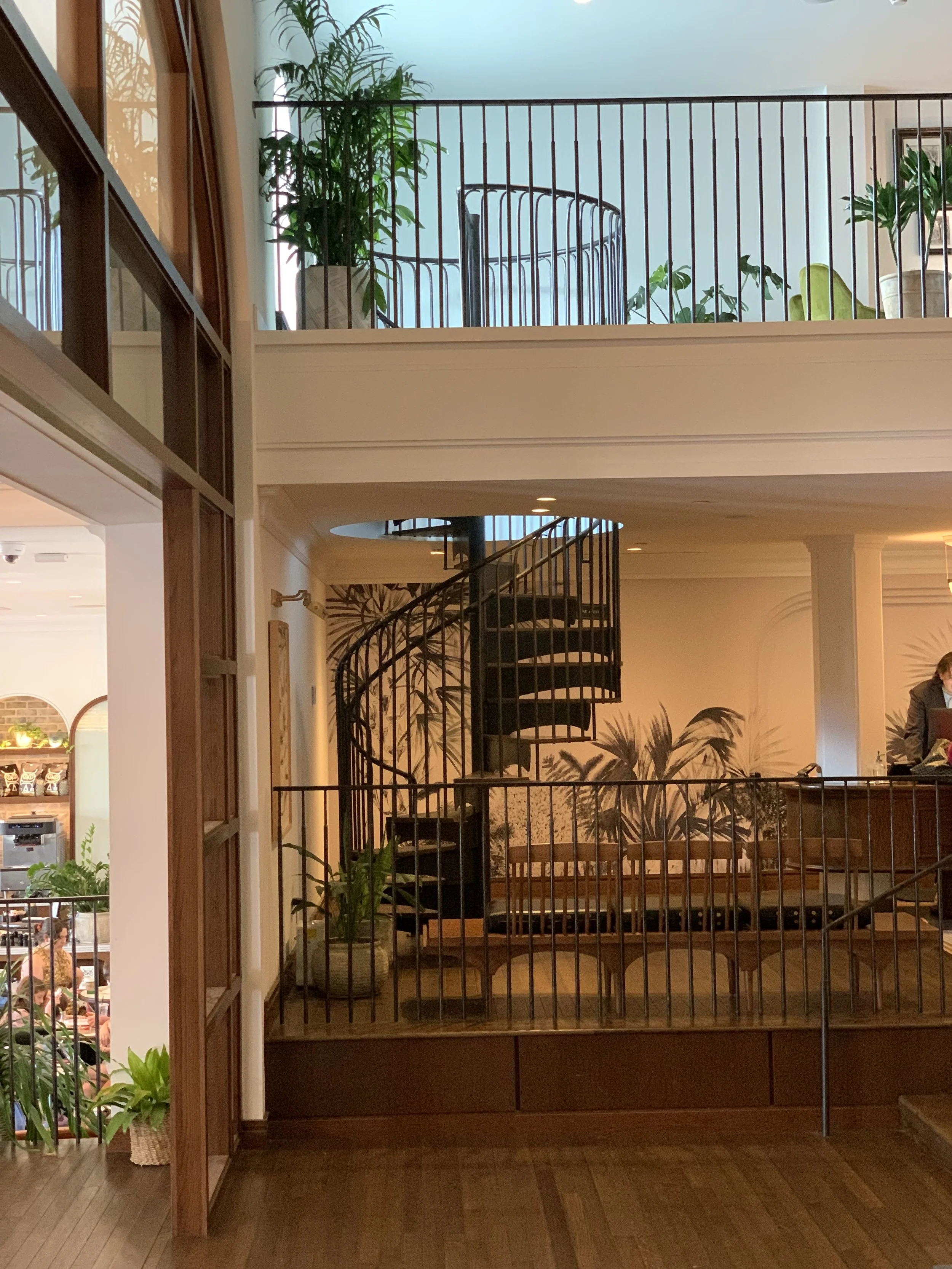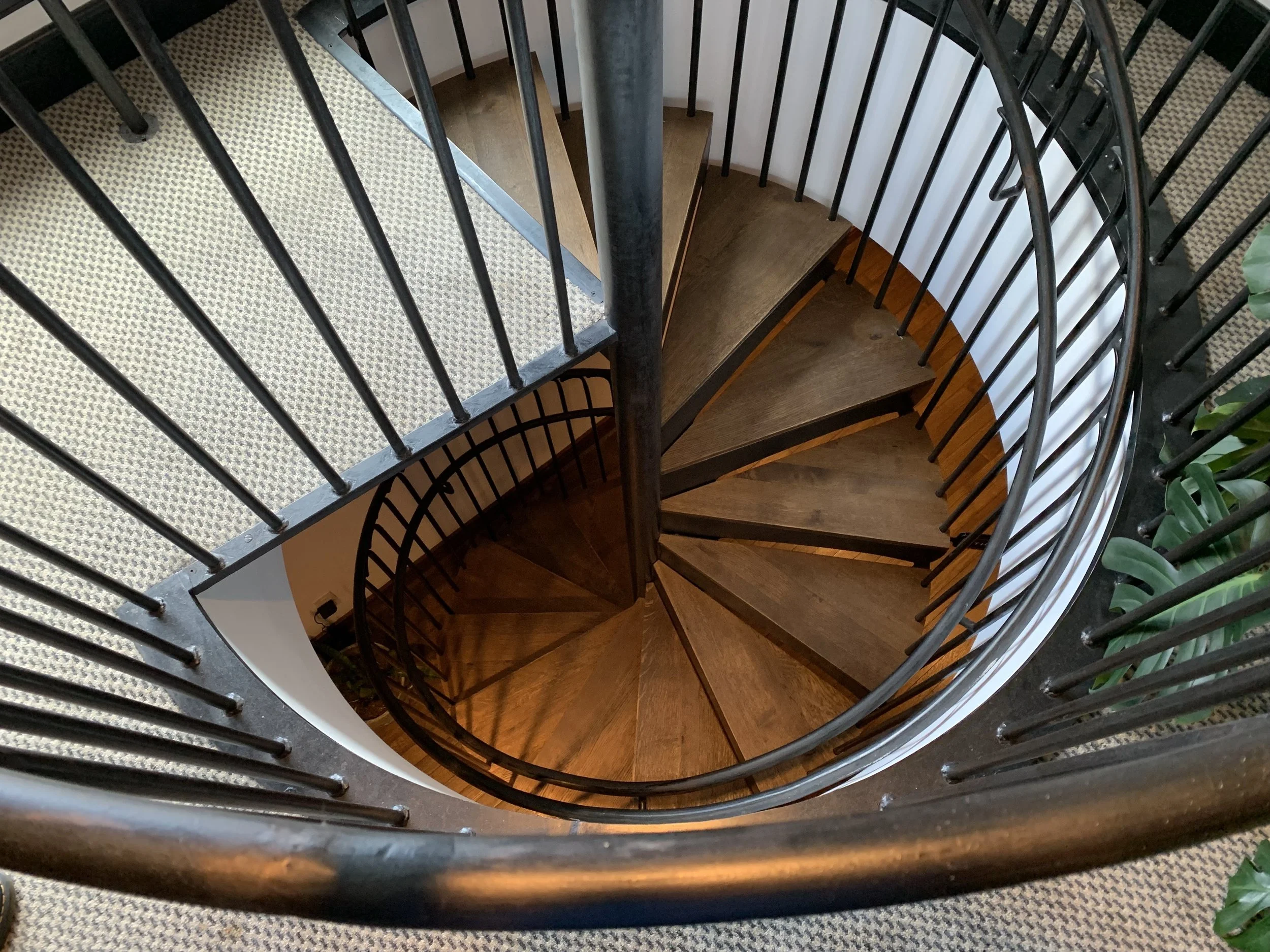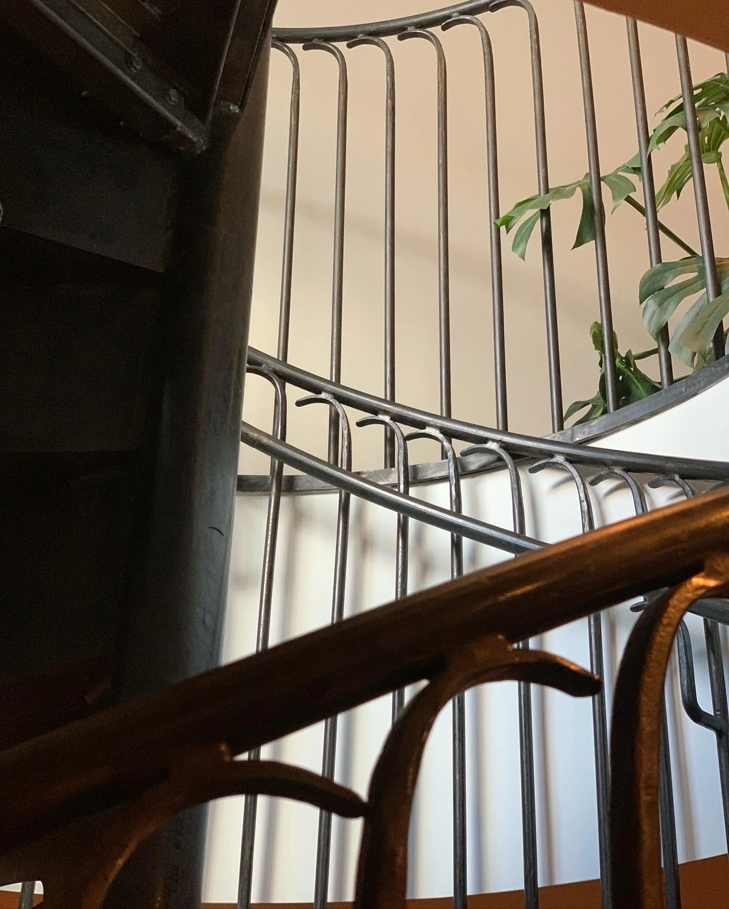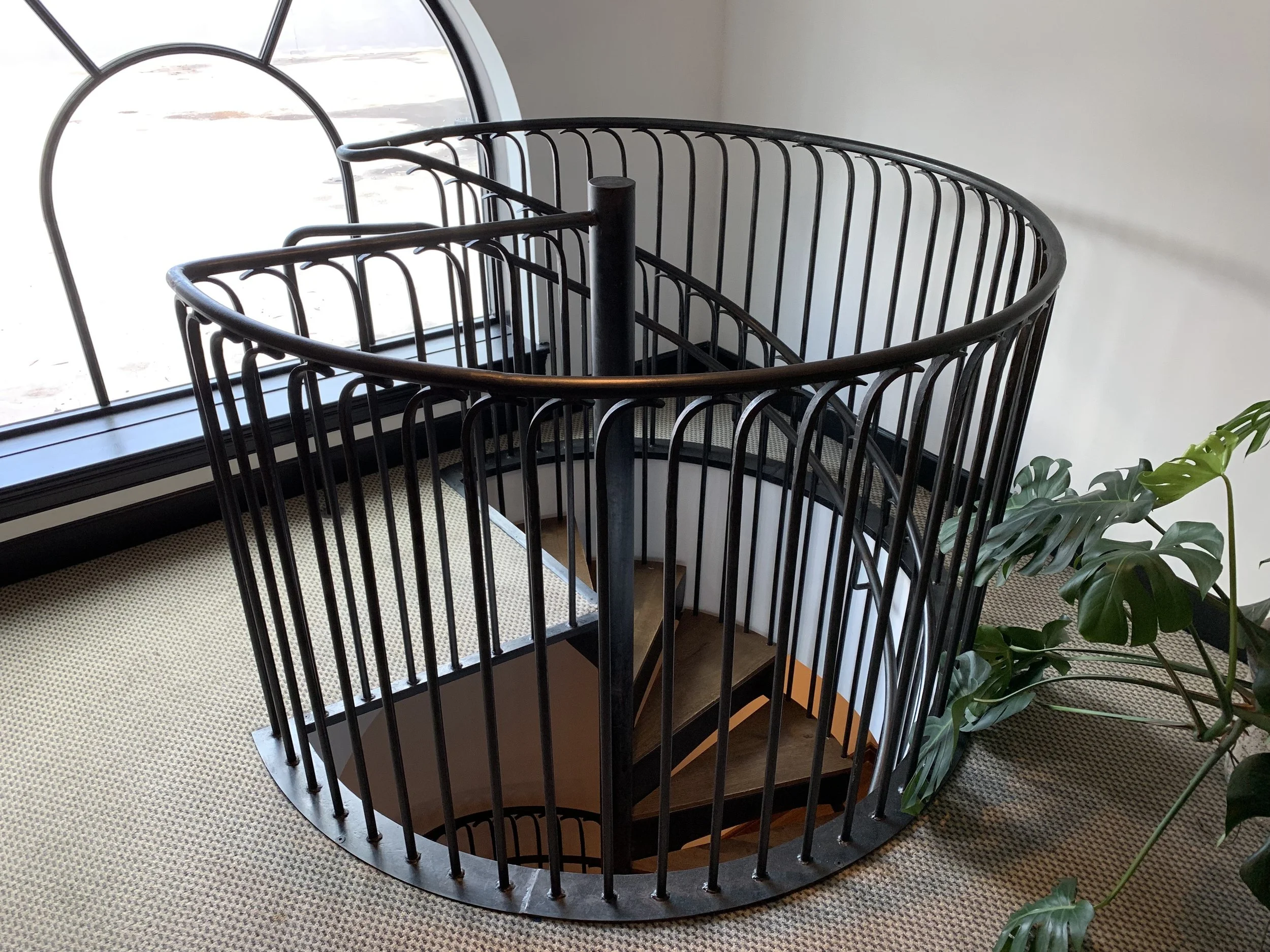 Forged steel spiral stair with hardwood treads, designed for compact circulation in a boutique hotel. Combines structural clarity with sculptural presence, serving as both access and focal point within the space.