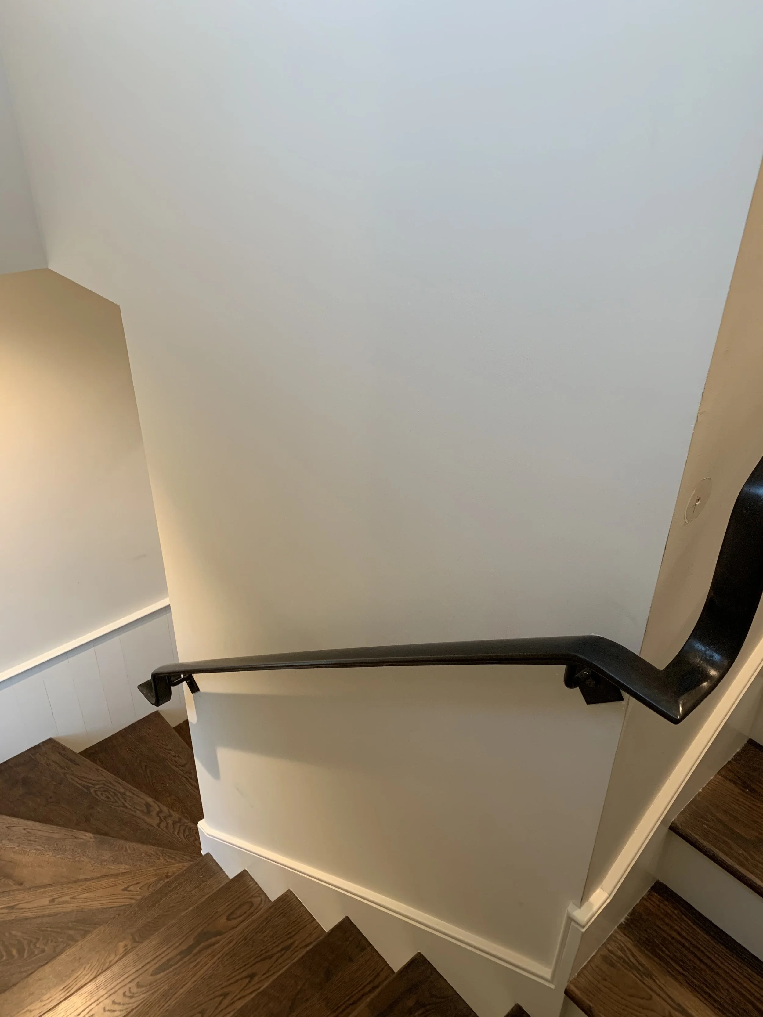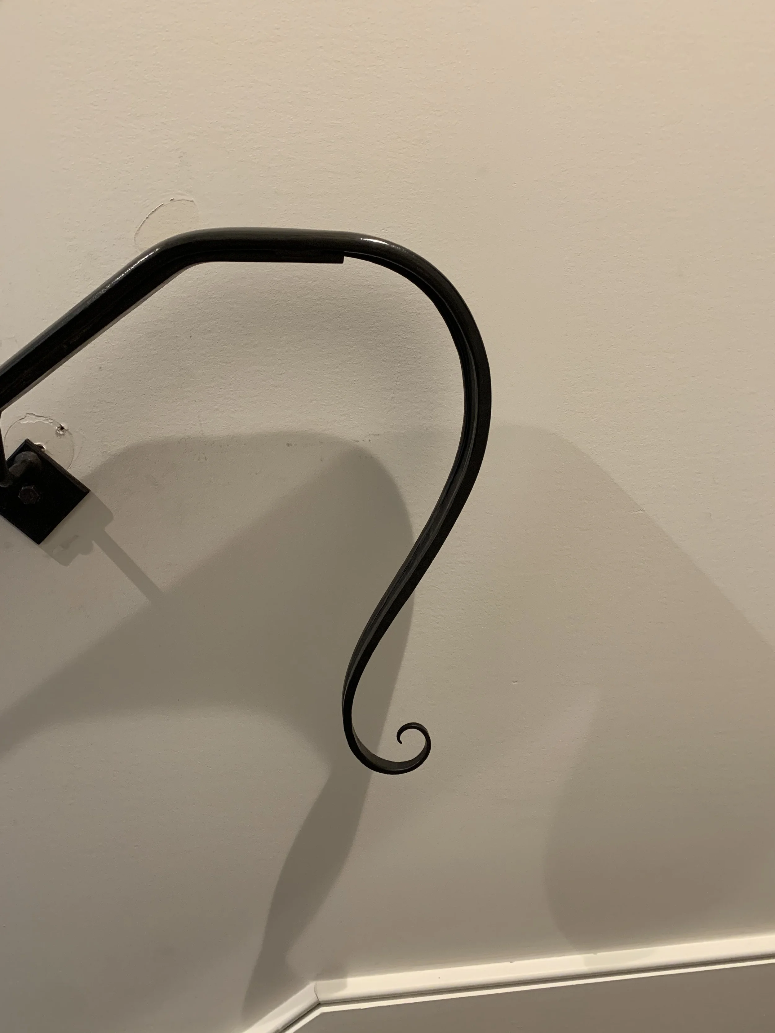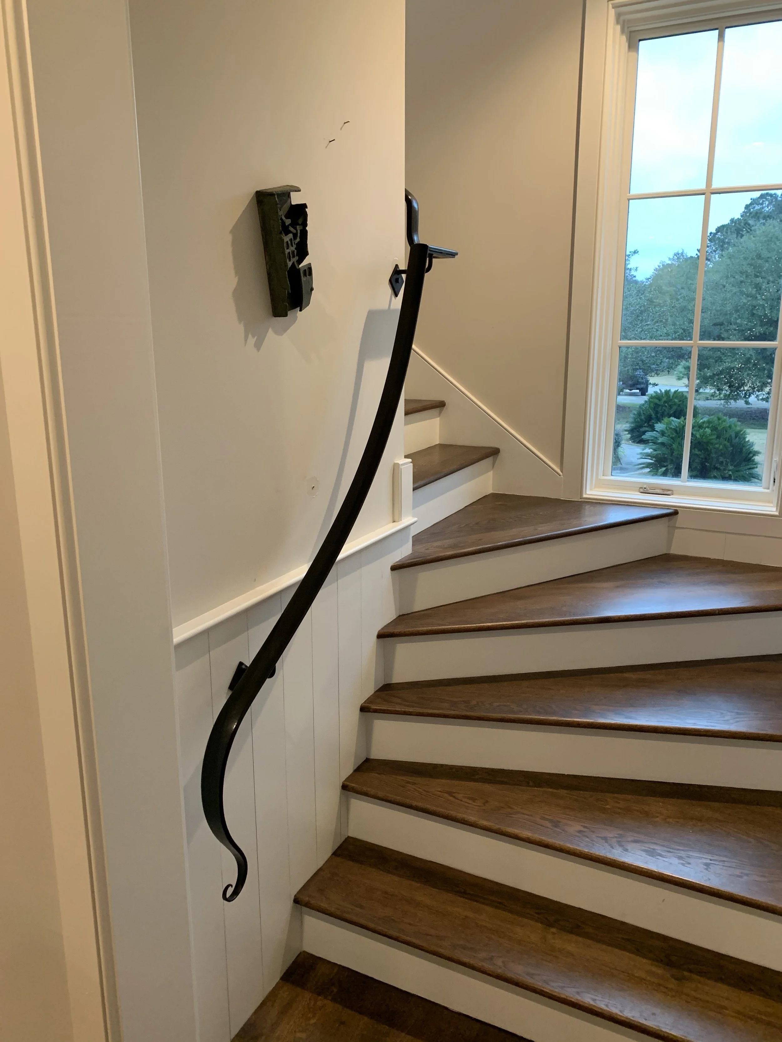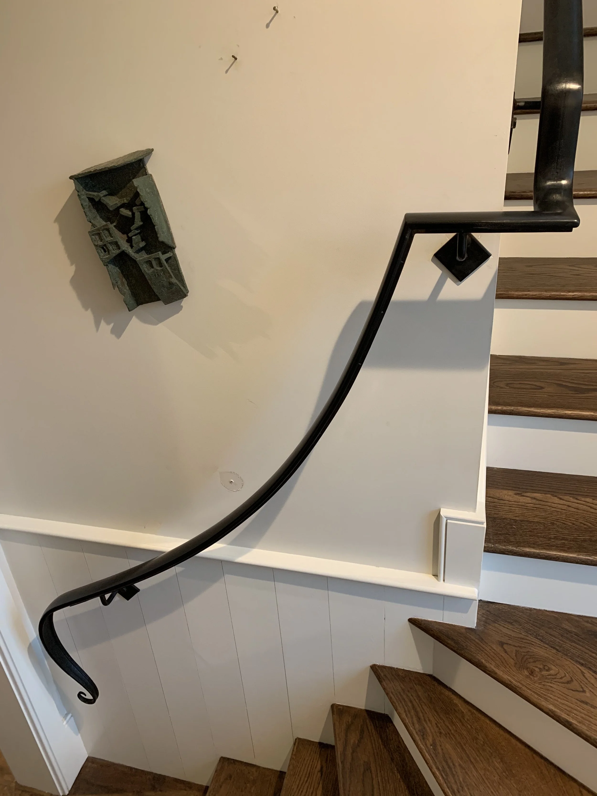 Wall-mounted stair rail forged from solid steel, designed to transition fluidly with the geometry of a tight stairwell. The tapered profile and curled return provide tactile clarity and visual lift, integrating subtle detail into a minimal architectural setting.